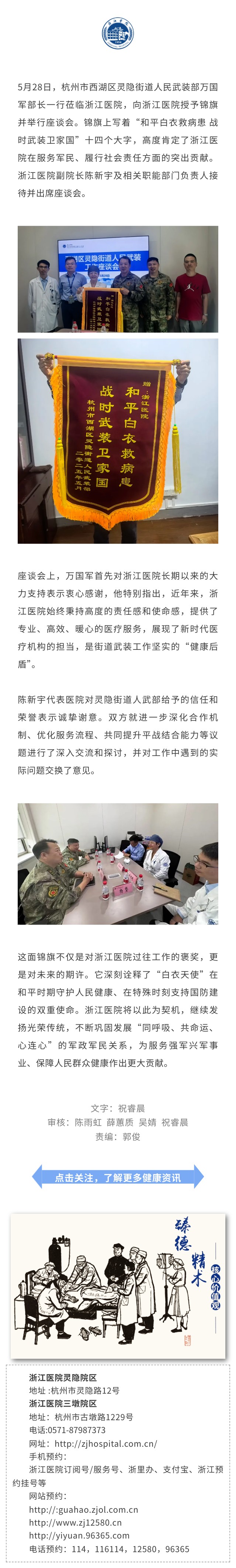 戎装映白衣,共建护家园——灵隐街道人武部向浙江医院授予锦旗
