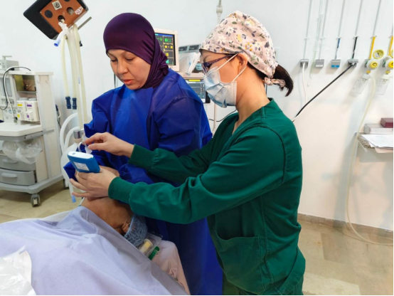除了日常繁重的手术麻醉工作,熊颖芬医生还挤时间与当地麻醉医生一起分享先进的麻醉技术。面对肥胖、脊柱畸形、棘上韧带钙化或老年人韧带硬化等采用正中入路穿刺困难的患者,她耐心讲解旁正中入路提高穿刺成功率的方法;分享中心静脉穿刺置管术的操作要点和临床经验;手把手教当地技师使用可视喉镜。得益于南昌大学第一附属医院麻醉科陈世彪主任的支持,她从国内带来可视喉镜等设备,有效解决了当地频繁出现的困难气管插管问题,使得当地麻醉医疗水平有效提升。