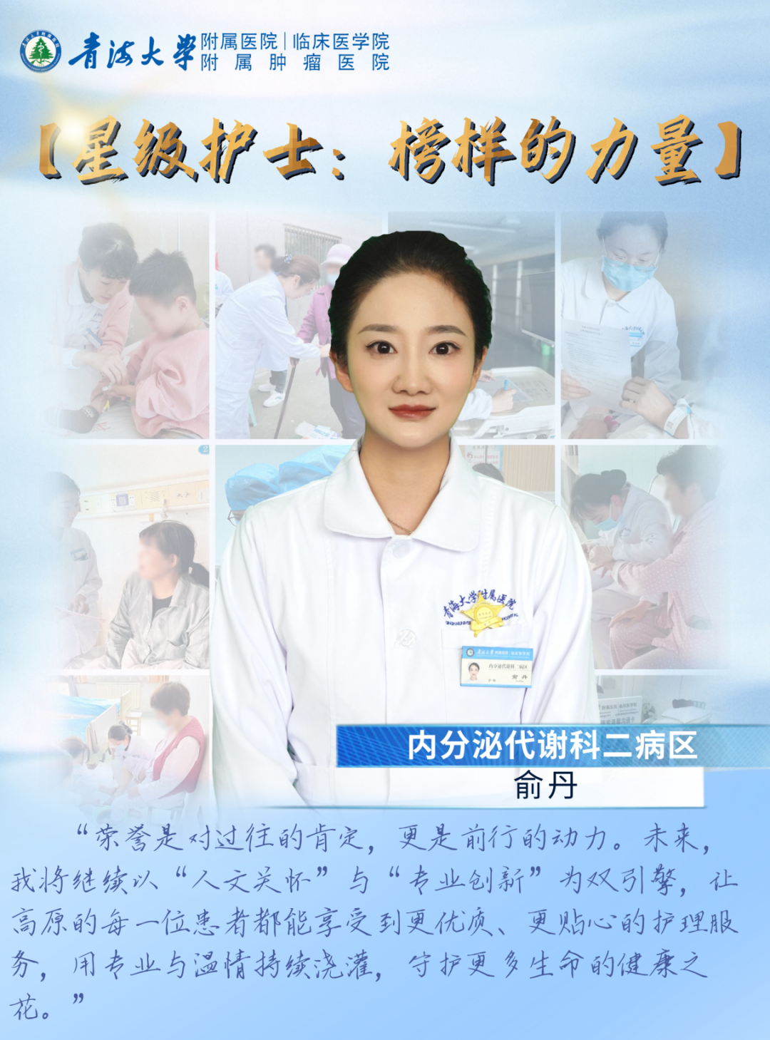白衣执甲,温柔如光;步履匆匆,却为生命驻足。她们是生命的守护者,用温柔与专业抚平病痛;她们是黑夜里的微光,用坚守与奉献点亮希望。此刻,就让我们一同探寻内分泌代谢科二病区“星级护士 —— 俞丹”背后的故事。