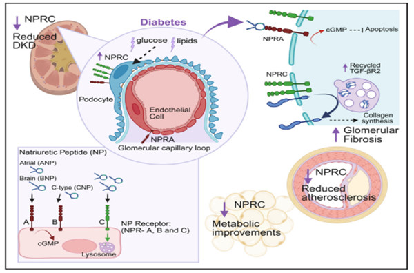 图:NPRC缺失有助于血糖控制并减轻肥胖、动脉粥样硬化和糖尿病肾病。NPRC结合3种NP配体并调节NP对其他受体的利用率。王鑫陆等人证明,NPRC可调节足细胞中促纤维化受体TGF-βR2的再循环,从而调控肾小球纤维化,