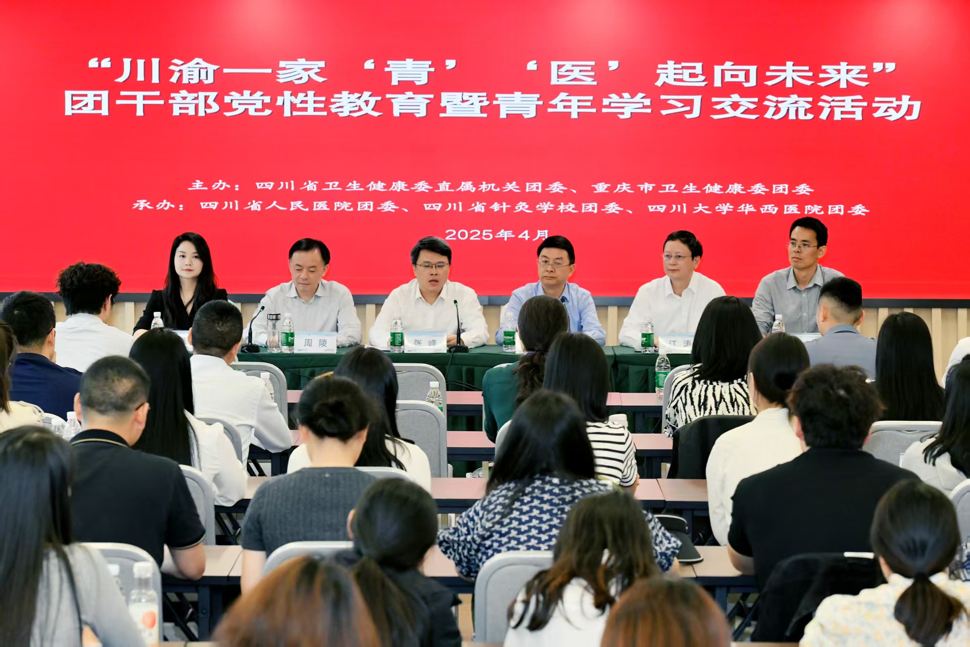 4月28日-29日,四川省卫生健康委直属机关团委会同重庆市卫生健康委团委在川联合举办“川渝一家‘青’ ‘医’起向未来”团干部党性教育暨青年学习交流活动,省卫生健康委党组成员、副主任、机关党委书记张峰,重庆市卫生健康委二级巡视员夏雄伟出席活动开班式并讲话,省卫生健康委二级巡视员江涛主持,省人民医院党委副书记周陵出席并致辞。省卫生健康委二级巡视员兰勇及川渝卫生健康系统团干部、青年代表60余人参加。