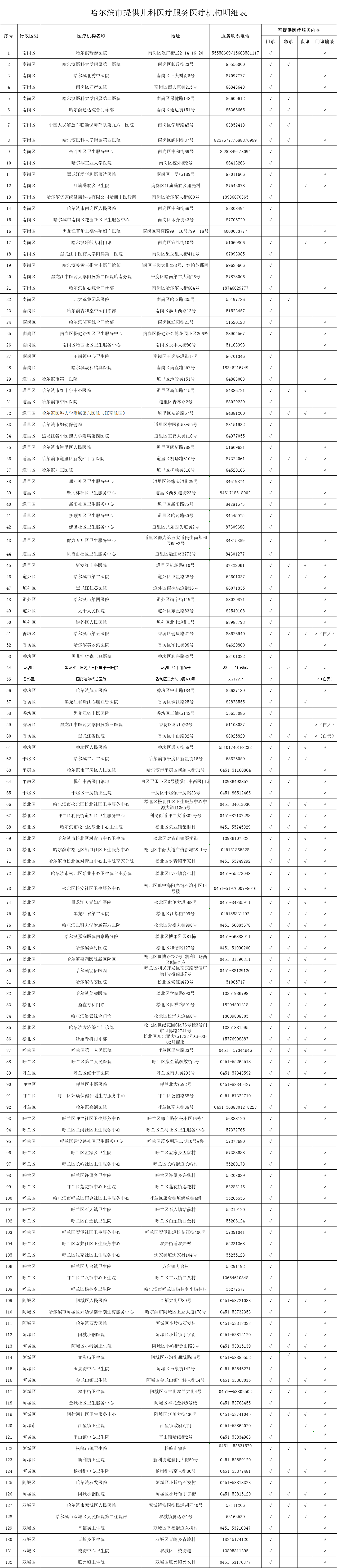 哈尔滨市提供儿科医疗服务医疗机构明细表