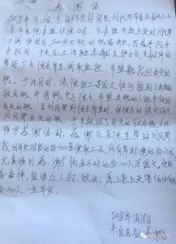 副院长张广奇亲自做了失物登记,经清点,包内有现金七千余元;当即通过医院保卫科、医院办公微信群等发出通知,多方寻找失主,当天上午即找到并将钱包归还给失主刘凤琴。18日,失主刘凤琴专程送来感谢信,原来她是带患病的孩子来医院治疗,在办理住院手续时不慎将钱袋丢失。她在信中感谢所有帮助她的好心人,尤其是拾金不昧的马国文,希望上苍赐福所有的好心人一生平安。